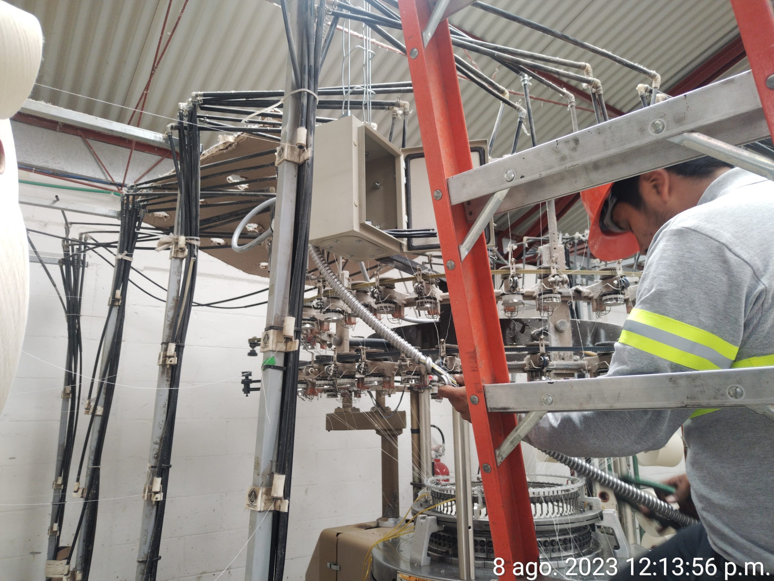 En la empresa American Cotton, se nos encomendó la tarea de conectar 9 maquinas tejedoras circulares, la instalación eléctrica se realizo desde un tablero existente, para lo cual se instalo una trayectoria de 50 mts de canalización tipo charofil, electro malla soldada zincada, realizando curvas, reducciones y conexiones de la misma a tableros y equipos, se instalo cable de la marca: conductores monterrey de la línea armoflex de 3 conductores mas neutro y tierra, logrando realizar la instalación eléctrica en el menor tiempo posible y quedando las maquinas en funcionamiento, sin problema alguno.